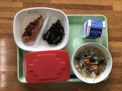 7月最初の献立は、ご飯、牛乳、バサのフライ、磯煮、豚汁でした。バサは白身魚でさっぱりしていました。