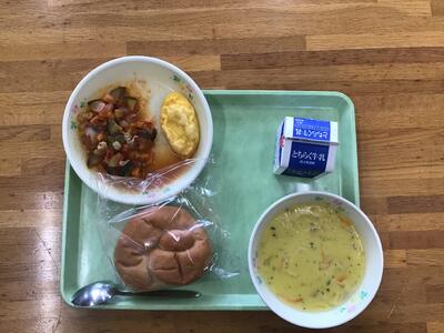 今日の給食は、米粉パン、牛乳、オムレツ、ラタトウィユ、コーンポタージュでした。夏野菜のズッキーニが美味しかったです。