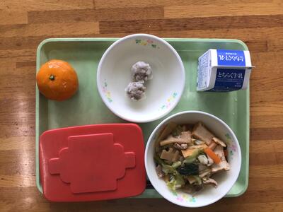 今日の給食は、ご飯、牛乳、じゃーじゃんどうふ、エビシューマイ、冷凍みかんでした。暑い日だったので、冷凍みかんはピッタリでした。
