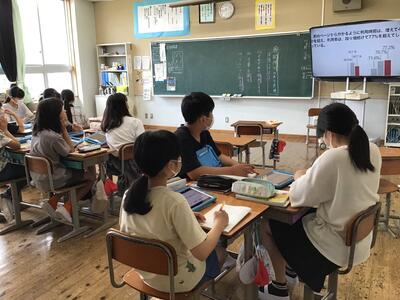 それをタブレットを使ってまとめ、お互いのグループの提案を聞き合いました。この後、感想を伝え合い、説得力のある提案書の工夫についてまとめる予定です。