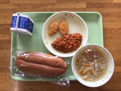 今日の給食は、ドックパン、牛乳、スラッピージョーの具、チキンナゲット、たまごスープでした。チキンナゲットが子供達には大人気でした。