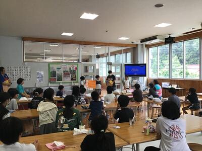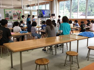 始めに、担当の児童が、大型モニターに写しながら、織姫と彦星の話をしました。それから、みんなで、折り紙に願い事を書いて、天の川に貼りました。「たなばたさま」の歌を聞いたり、七夕クイズをしたりと、楽しい集会になりました。暑い日が続いていますが、ランチルームには、涼しそうな天の川が、飾られました。みんなの願いが、天に届きますように。楽しい集会を企画してくれた高学年のみなさん、ありがとう。
