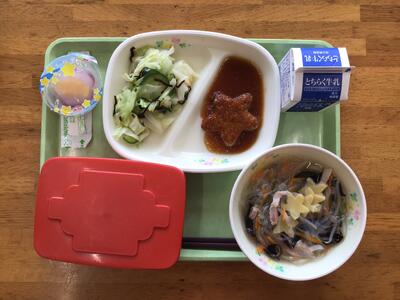 今日の給食は、ご飯、牛乳、ハンバーグおろしソース、塩昆布和え、七夕スープ、七夕デザートでした。七夕に合わせて七夕献立でした。お星様がたくさんありました。