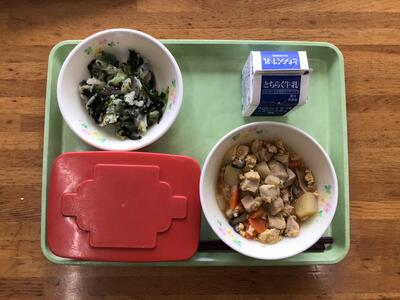 今日の給食は、ご飯、牛乳、親子煮、のり和えでした。とっても美味しくいただきました。