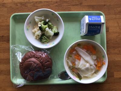 今日の給食は、ココアロール、牛乳、花野菜サラダ、ワンタンスープでした。パンはふわふわ、サラダはさっぱり、スープはニンジンの歯応えも良く、とても美味しかったです。