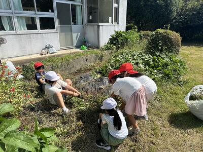 今日は、2年生が生活科で畑の草むしりをしました。これは担任が指示したものではなく、子供たちから畑(花壇)の草を取らないと作物が育たないという意見が出て、行動にうつしたそうです。暑い中でしたが、汗ビッショリになって草を取りました。