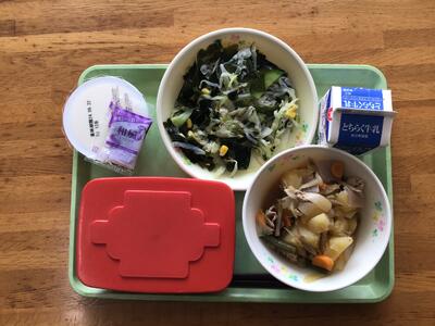 今日の給食は、ご飯、牛乳、豆腐のサラダ、ピリから肉じゃがでした。豆腐サラダは、和風ドレッシングでさっぱりして美味しかったです。ピリから肉じゃがは、ご飯が進みました。
