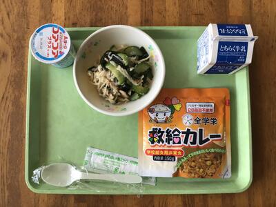 今日の給食は、「防災救食」でした。献立は、きゅうきゅうカレー、牛乳、きりぼしだいこんのサラダ、ヨーグルトでした。いつ、どこで災害にあってしまうかわかりません。災害の時にはどんな食事が出るのかを知っていることも大切だと思います。今日は、サラダやヨーグルトもあったので、本当に災害にあった時よりは栄養も量もある程度足りているかと思いますが、それでもいつもの給食とは違っていて戸惑っているようでした。良い勉強になったのではないかと思います。