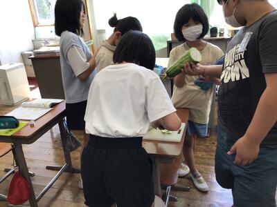 5年生は、ヘチマの観察をしました。春にまいたヘチマが実になったので、切って中の様子を観察しました。