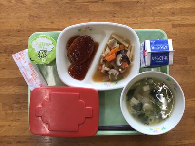 5月1日の給食は、ご飯、牛乳、たけのこご飯の具、ハンバーグ、アサリの味噌汁、ゼリーでした。この日はこどもの日献立でした。すくすく成長するたけのこは、ご飯によく合いました。アサリの味噌汁、ハンバーグもとても美味しかったです。