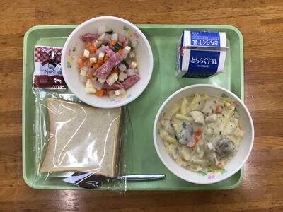 今日の給食は、食パン、牛乳、チョコレート、マカロニのクリーム煮、カリコリサラダでした。連休前、美味しい給食でパワーをもらいました。子供達も美味しそうに食べていました。