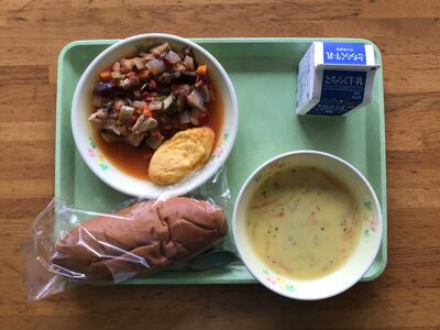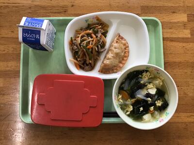 今日の給食は、ご飯、牛乳、揚げ餃子、チンジャオロース、たまごスープでした。大きな餃子は人気です。