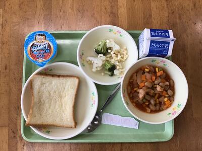 7月12日の給食は、メープルトースト、牛乳、チキンビーンズ、はなやさいサラダ、カップアイスでした。アイスが大人気でした。