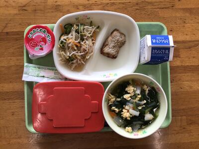 今日の給食はご飯、牛乳、モロのスタミナ焼き、ナムル、かんぴょうの卵汁、ゼリーでした。今日はさつきランチで、美味しくいただきました。