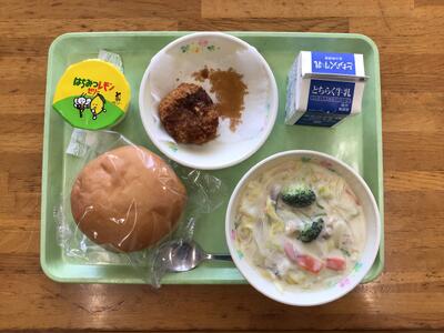 今日の給食は、丸パン、牛乳、メンチカツ、キャベツのクリーム煮、はちみつレモンゼリーでした。クリーム煮は具沢山でおいしかったです。はちみつレモンゼリーのカップの絵が懐かしい感じがしました。