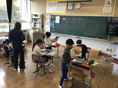 1•2年生の国語の授業で、図書室の利用の仕方を学習しました。図書室の先生からお話を聞き、1年生は初めて本を借りました。落ち着いて読書を楽しんでいました。