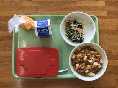 今日の給食は、ご飯、牛乳、マーボー豆腐、ナムル、オレンジでした。今日は中華です。マーボー豆腐もナムルもとても美味しかったです。オレンジも食べやすく、甘かったです。