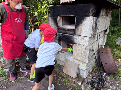粉からピザを作りました。思い思いの形にして、トッピングを乗せて、石窯で焼いたピザは、格別でした。