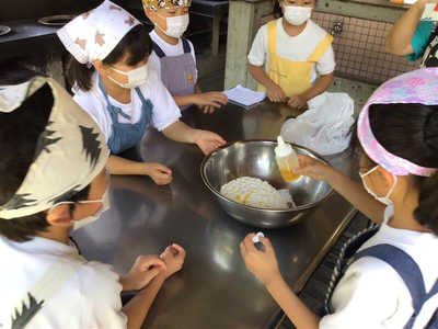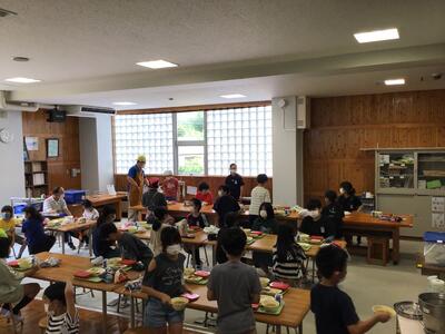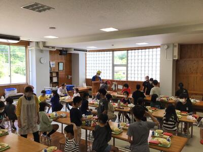 今日から第2ランチルーム(仮称)での給食が始まりました。今までのランチルームに比べると少し狭いですが、エアコンが効いて快適です。5年生以下は向き合っての給食が初めてで、今までとは違った雰囲気で食べられたようです。この部屋での給食は、暑い時期の9月一杯くらいを考えています。