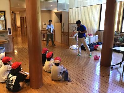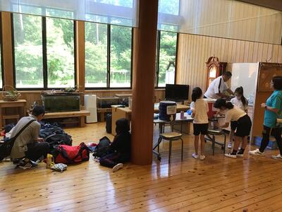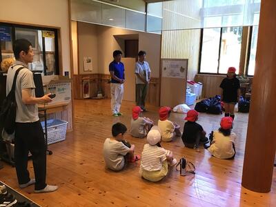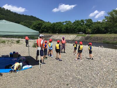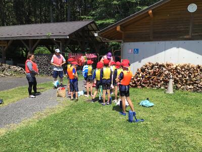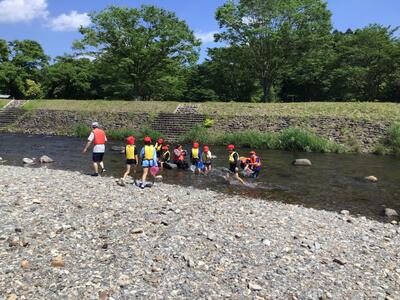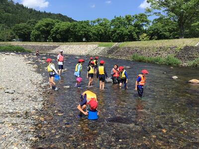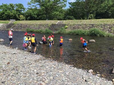 午後の川遊びをしました。最初は浅い場所で生き物を探すなどして過ごしました。後半は、板荷中学校の皆さんと一緒に川上りをしました。少し深い場所や流れが早い場所もありましたが、みんなで協力し、声を掛け合ってかなり上流まで上りました。センターの先生からは、今年度一番上まで上りましたと言っていただきました。(水の中に入ったので、写真は撮れませんでした)