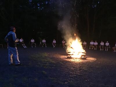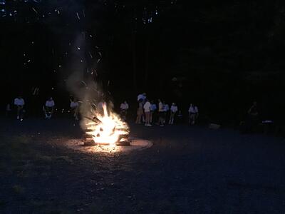 本日最後の活動のキャンプファイヤーが行われました。小学生、中学生がそれぞれ出し物やゲームを行なって、とても盛り上がりました。その後、吊り橋でホタルを見ました。