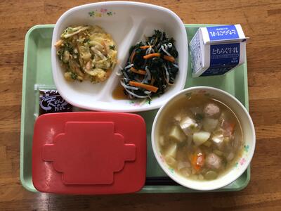 本日の給食はご飯、牛乳、野菜かき揚げ、和風あえ、石狩汁、天丼のタレでした。野菜かき揚げと天丼のタレが混ざると、何杯でもご飯が食べられる感じでした。和風あえもおいしく、石狩汁のバターの風味も最高でした。