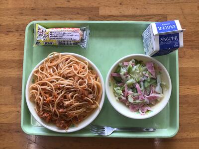 今日の給食は、ミートスパゲッティ、牛乳、ハムのマリネ、米粉ドックでした。子供達に人気のメニューなので、モリモリ食べていました。