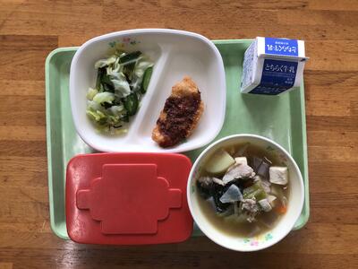 今日の給食は、ご飯、牛乳、バサのフライ、塩昆布あえ、豚汁でした。バサのフライはフワフワで、とても美味しかったです。