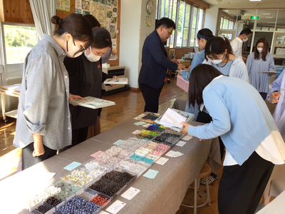 開級式の後は、「天然石Bang-Bang」のオーナーの方に講師として来ていただき、研修会が行われました。天然石についてのクイズなどを交えながら、パワーストーンを使ってのブレスレットやストラップなどの作り方を教えていただきました。