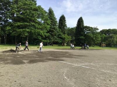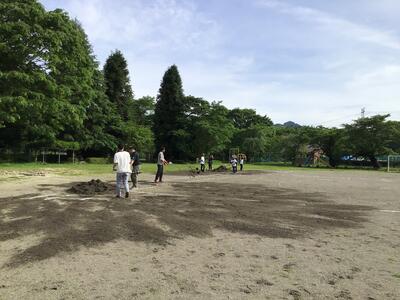 板荷小学校の校庭は、雨が降ると大きな水たまりができてしまいます。これをなんとかできないかと職員で考え、先日水が流れるように溝を掘ってみました。これは大きな効果があり、先日の雨の後の水たまりは、以前の半分以下になりました。今回は第二弾として、砂を4トン搬入していただき、職員作業で校庭にまきました。目前に迫った運動会や今後の体育の授業など、少しでも子供たちが使いやすい校庭になるように、職員一同頑張っています。