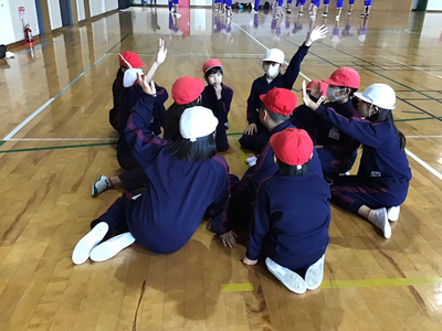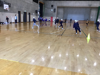 朝から雨が降っているので、体育館で菊西小と一緒に、3本線です。