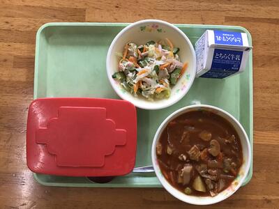 今日の給食は、ご飯、牛乳、ハヤシシチュー、ツナサラダでした。ツナサラダの程よい酸味とハヤシシチューの深みのあるコクが最高に美味しかったです。子供たちも美味しそうに食べていました。