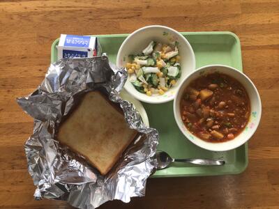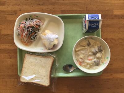 14日(金)の給食は、メープルトースト、牛乳、カレービーンズ、かんぴょうのサラダでした。メープルトーストが甘くて美味しかったです。