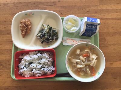 今日の給食は、わかめご飯、牛乳、鶏肉のから揚げ、海苔和え、味噌汁、手作りゼリーでした。今日は中学校のリクエスト給食でした。手作りゼリーは手間がかかると思いますが、その分とても美味しかったです。