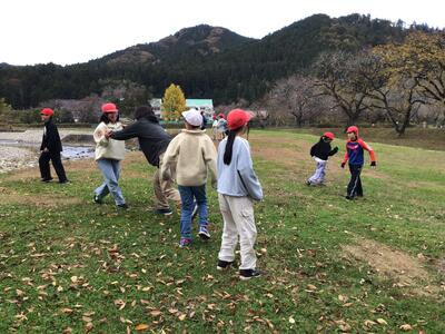 自分の学年の順番が来るまで、外で待ちました。その時に六年生が楽しいゲームをしてくれました。帰りには、せせらぎ公園でおにごっこもしました。