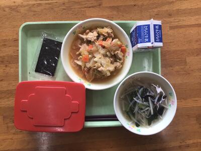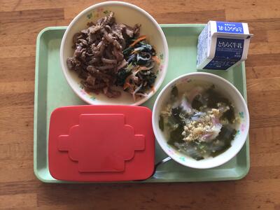 今日の給食は、ご飯、牛乳、ビビンバの具、ワカメスープでした。大人気のビビンバです。子供達も喜んで食べていました。