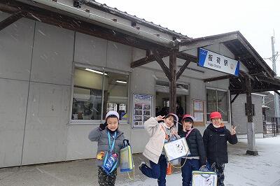 雪の板荷駅をスタート寒さの中でも笑顔の子供たち