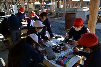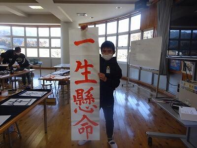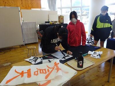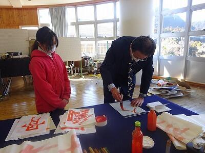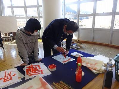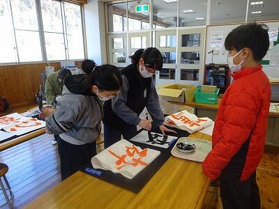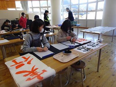 6年生が卒業に向けて、習字の練習をしています。子供たち一人一人が書きたい四字熟語を決め、書き上げた条幅の作品を卒業式で掲示します。
