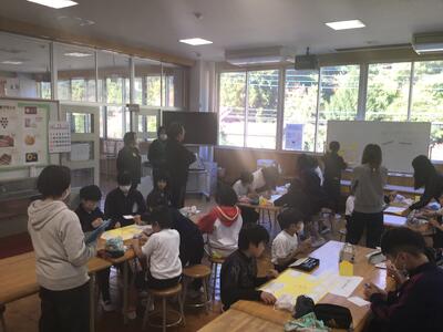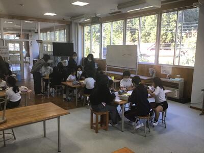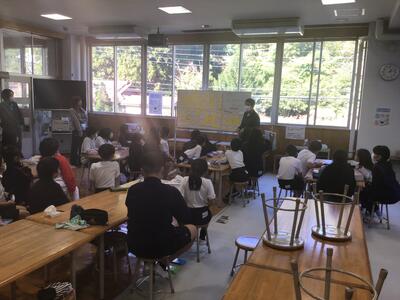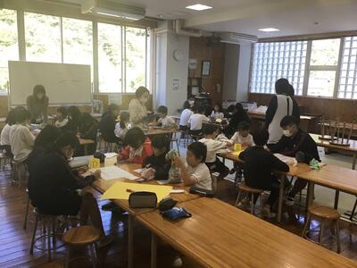 今日の昼休みに、全校遠足の振り返りを行いました。全校遠足の前に班ごとにスローガンと、そのスローガンを達成するための具体策を考えました。今日は、その具体策をもとに、自分達の行動を振り返りました。一人一人が振り返って、班ごとに1枚の色画用紙に貼ってまとめました。みんな十分に具体策を意識して行動していたので、できたこと、守れたことがたくさんあり、今回振り返ることで自尊感情を育てられたのではないかと思います。