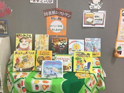 今日から読書週間が始まりました。それに合わせて、図書支援さんが図書室前の廊下をリニューアルしてくれました。今月は「絵本とコラボ給食」が予定されているので、図書館レストランのコーナーができていました。楽しい本がいっぱいあるので、たくさん読んで欲しいと思います。