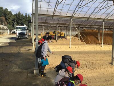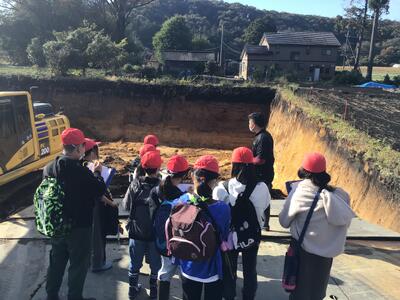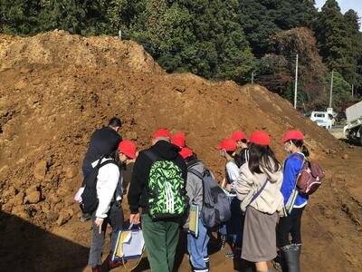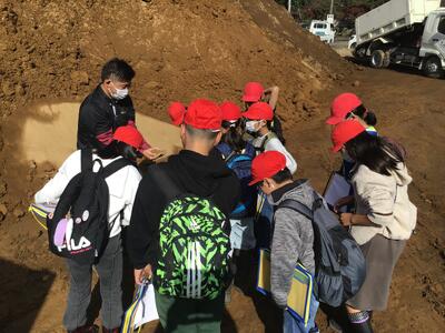 本日、6年生が「株式会社大張」さんの工場現場に行って、地層の見学をさせていただきました。昨日が雨だったので心配していましたが、予定通り実施できました。最初は、実際に土を掘っている現場を見せていただきました。黒土や赤玉土、鹿沼土の地層の様子を見せていただき、それぞれの土の性質や作業の進め方などを、係の方に説明していただきました。また、実際に鹿沼土を触らせていただきました。