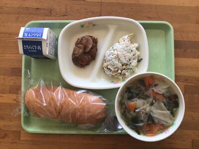 今日の給食は、県産小麦ミルクパン、牛乳、ハンバーグのアップルソースがけ、ツナと大豆のサラダ、ワンタンスープでした。柔らかいパンにツナをはさむと、とても美味しかったです。