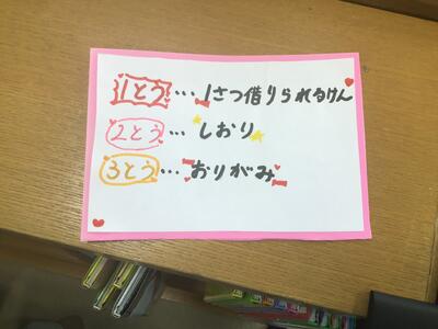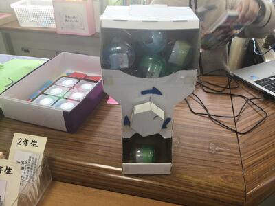業間は、図書室で本の貸し出しがありました。本を借りた児童は、図書委員特製の「ガチャガチャ」を引くことができます。出たカードによって、いろいろなサービスがあります。