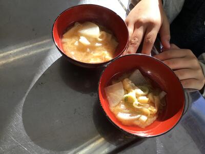 今日は5年生の調理実習でした。先日ご飯を炊きましたが、今日はお味噌汁です。鰹出汁と煮干しの出汁の2種類を作りました。具材が一緒なので、出汁による味の違いがよくわかりました。どちらも、とても美味しかったです。