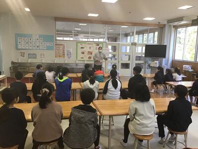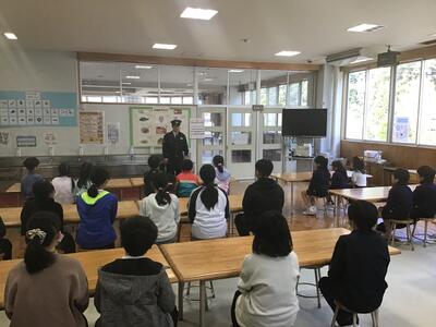 その後、スクールサポーターの方と駐在所の方から講話をいただきました。「いかのおかし」を守ることと、実際に不審者に会うととても怖いので、自分は大丈夫と思わないようにということを教えていただきました。また、代表児童が声をかけられた時にどうすればいいかを実際の動きも交えて教えていただきました。最後に質問や感想も児童から出てきて、自分ごととして捉えられているなと感じました。