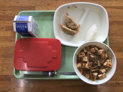今日の給食は、ご飯、牛乳、マーボー豆腐、揚げ餃子、にっこり梨でした。今日は塩ジョイランチでした。塩分控えめですが、しっかりした味付けで美味しかったです。餃子は普段の焼き餃子ではなく、揚げていました。