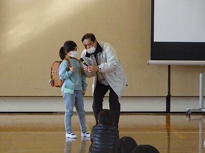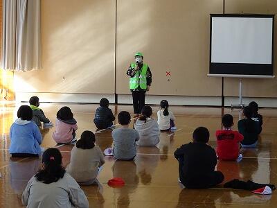 避難後は、体育館に移動し、防犯教室を行いました。DVDを視聴し、講師の大島様(スクールサポーター)、福田様(板荷駐在所警察官)、関根様(スクールガードリーダー)から防犯関係の指導をいただきました。