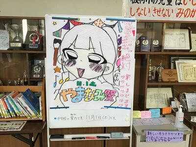 お隣の板荷中学校の学校祭の大きなポスターが掲示されています。本校の卒業生が描いたものです。