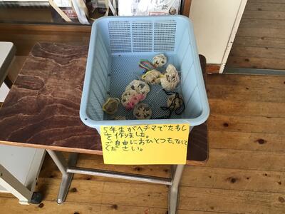 そして、5年生が理科の学習で育てたヘチマを使ってタワシを作りました。児童は好きなものを一つ選んで持っていっています。