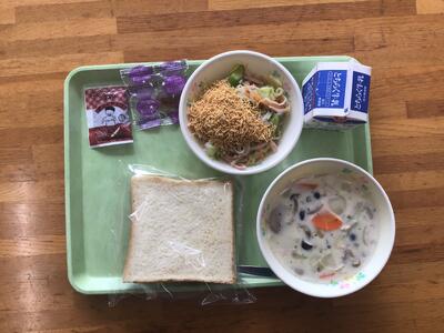 今日の給食は、食パン、チルドチョコ、シエニケイット、パリパリサラダ、グミでした。シエニケイットは、フィンランドの「キノコのクリームスープ」です。初めて聞いた献立でしたが、体が温まって、とても美味しかったです。